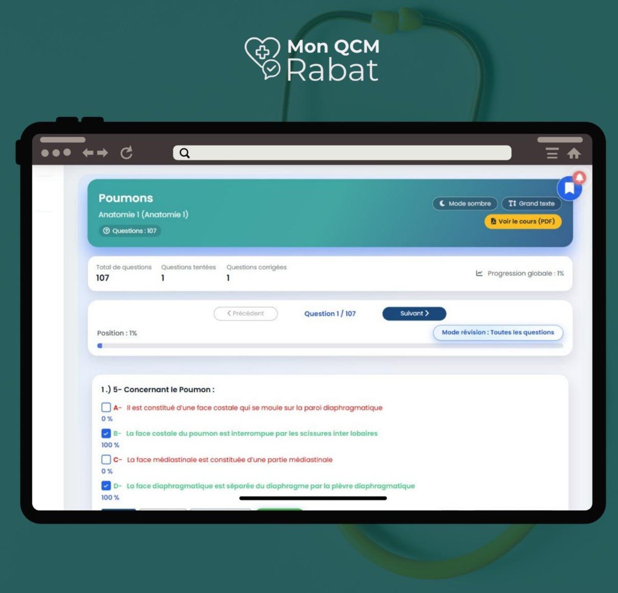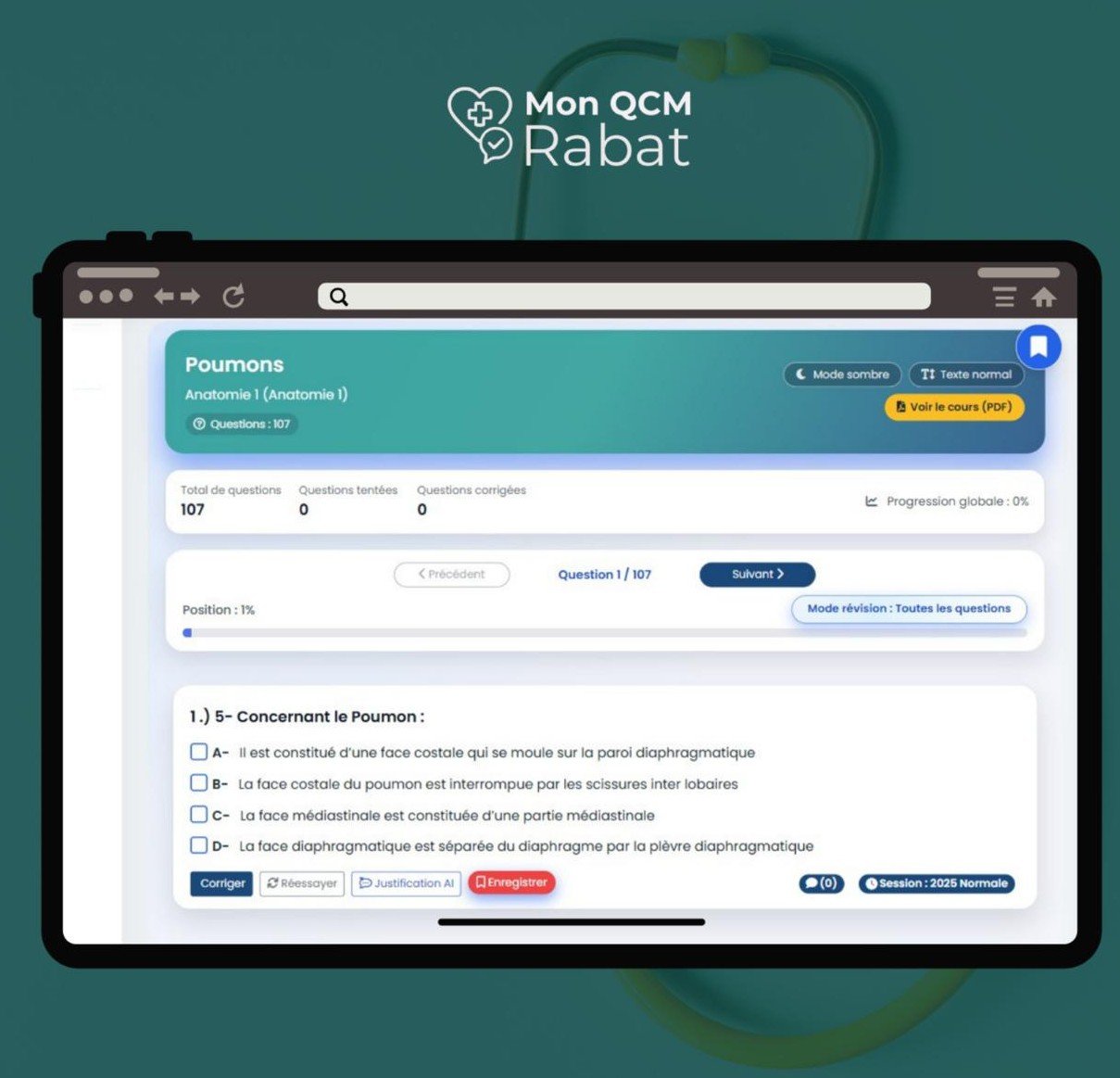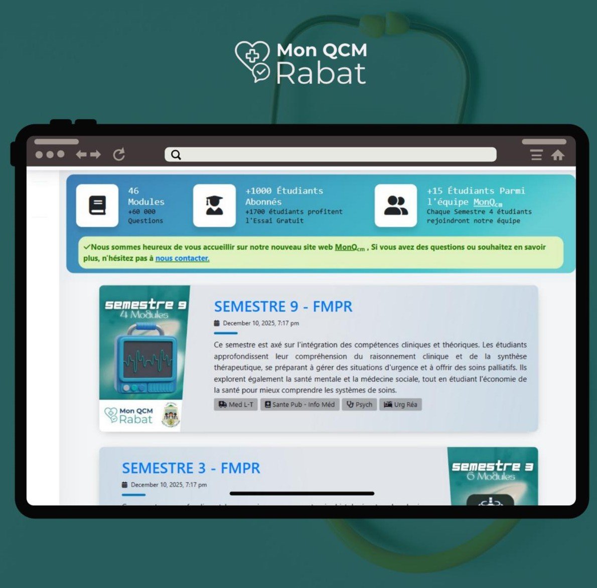 Après 4 années d’expérience à accompagner les étudiants de la FMPC, l’équipe MonQcm est enfin présente à Rabat. Nous mettons à votre disposition une solution numérique complète, pensée spécialement pour les étudiants de la FMPR. Notre plateforme regroupe des banques de QCM organisées par Session d'Examen et par chapitre, avec pour chaque question le cours associé afin de faciliter une révision profonde et structurée. Accessible sur mobile, MonQcm vous permet de vous entraîner où vous voulez et quand vous voulez, et d’optimiser efficacement votre préparation.