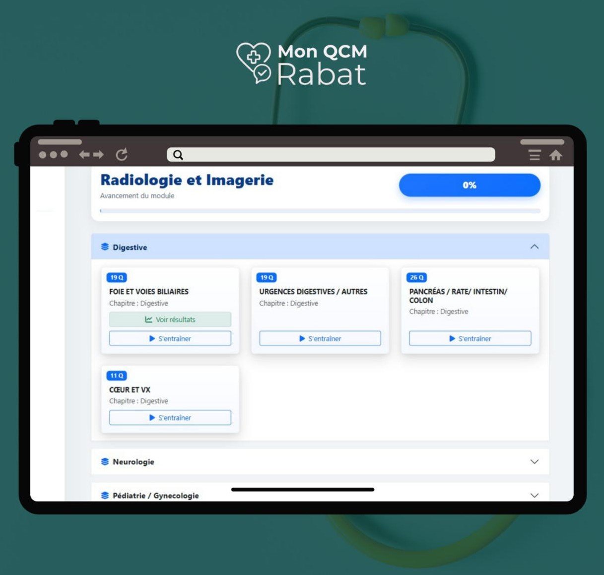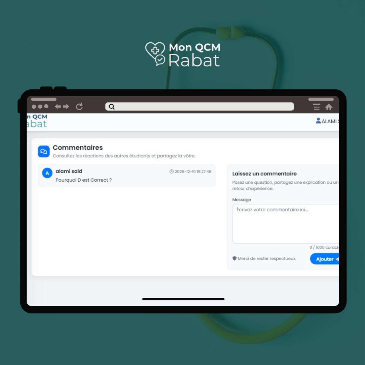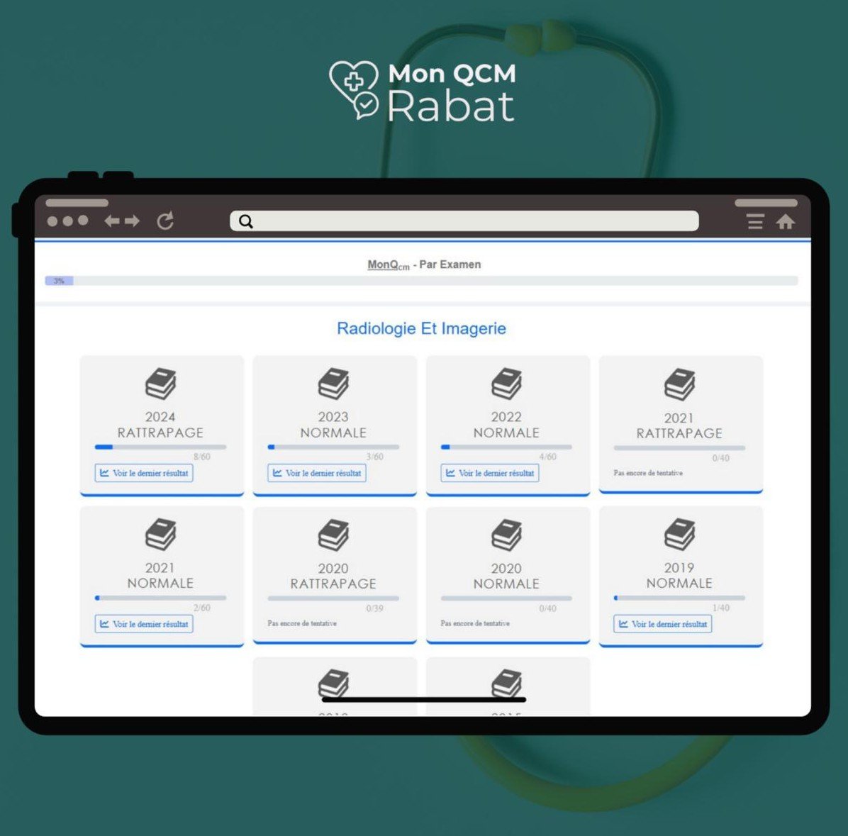 Après 4 années d’expérience à accompagner les étudiants de la FMPC, l’équipe MonQcm est enfin présente à Rabat. Nous mettons à votre disposition une solution numérique complète, pensée spécialement pour les étudiants de la FMPR. Notre plateforme regroupe des banques de QCM organisées par Session d'Examen et par chapitre, avec pour chaque question le cours associé afin de faciliter une révision profonde et structurée. Accessible sur mobile, MonQcm vous permet de vous entraîner où vous voulez et quand vous voulez, et d’optimiser efficacement votre préparation.